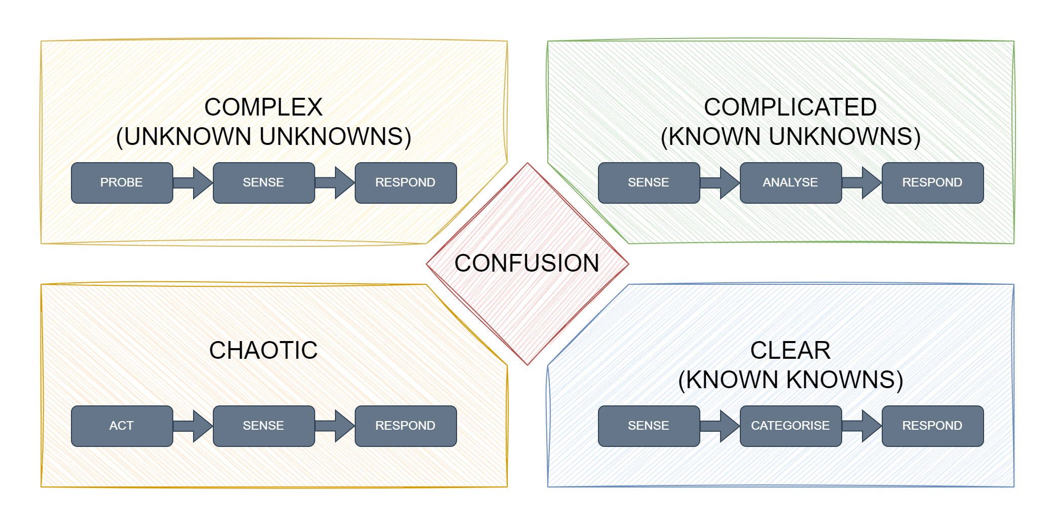 There is also a Confusion domain. This is for situations where you are unable to classify the problem into any of the other domains. You should think of it as a last resort. It’s quite rare to end up here, because the uncertainty and unpredictability has to be really high. It's usually an indication that what you’re seeing is an overlap of multiple problems, and your job is to start breaking the situation down into separate problems that can be placed in the other domains.