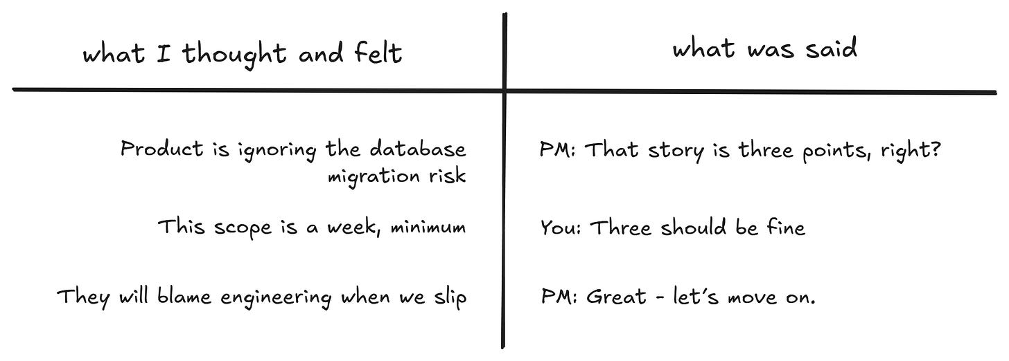 A helpful prompt while reflecting is to ask, “What did I need the other person to understand that never made it out of my mouth?” In the fragment above, the answer is obvious: “This story hides an invisible database migration and therefore a serious schedule risk.”